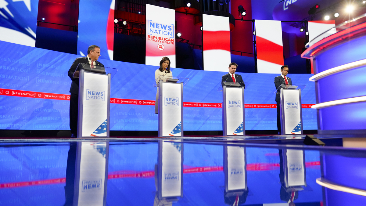 Republican presidential candidates from left, former New Jersey Gov. Chris Christie, former U.N. Ambassador Nikki Haley, Florida Gov. Ron DeSantis, and businessman Vivek Ramaswamy during a Republican presidential primary debate hosted by NewsNation on Wednesday at the University of Alabama in Tuscaloosa, Ala.