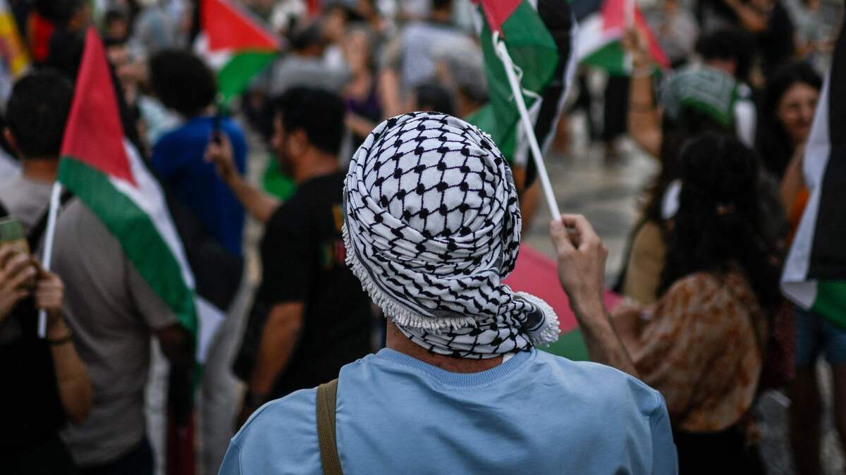 A protestor wearing a keffiyeh waves a Palestinian flag during a rally in support of Palestinians in Lisbon in October.