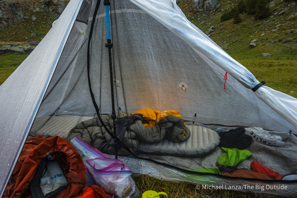 While there’s no doubt that windy nights helped ventilate the tent, it also developed very little condensation inside even on completely calm, cool nights in the upper 30s F (about 3° C). Much colder than that on a calm night, especially with the vestibule closed up, and I would expect some condensation. But the spacious interior also means your bag and clothes will rarely brush against the walls if they do develop condensation.